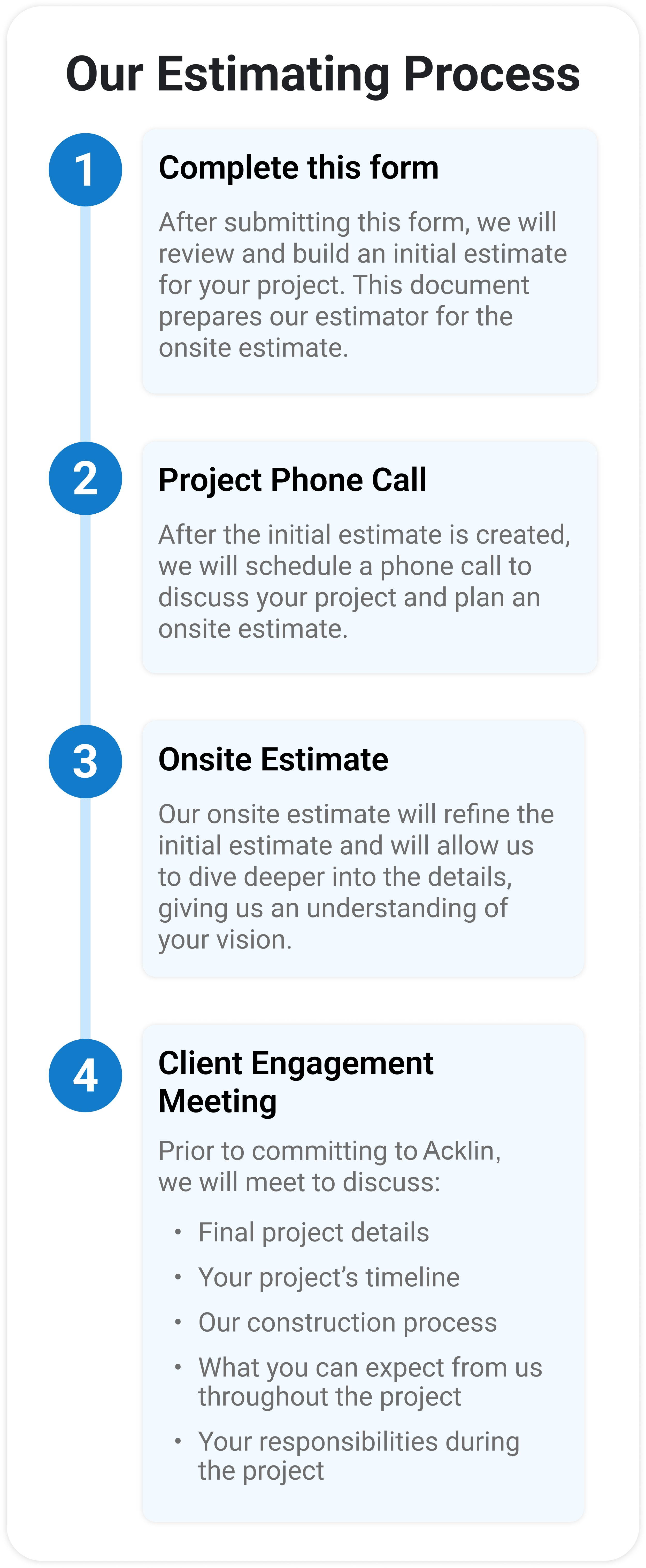 After you fill out this Initial Estimate Questionnaire, our Head of Construction will review the form, build a rough estimate of your project, and reach out to schedule an Initial Estimate Review to discuss your project.